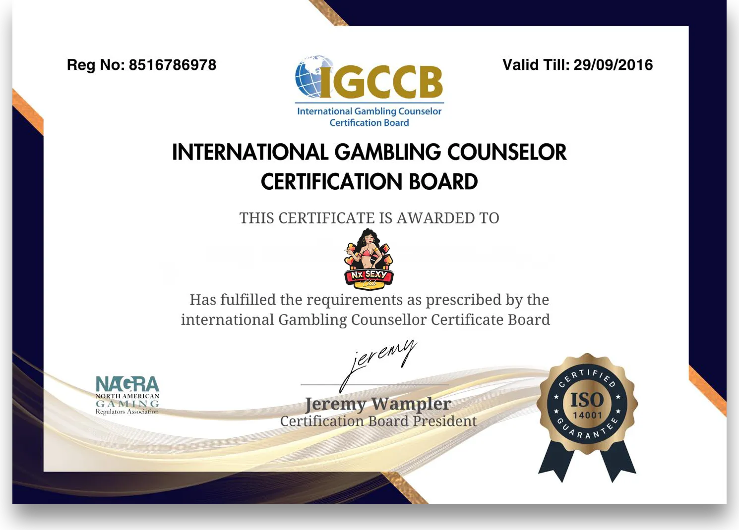 NX SEXY CLUB ได้รับอนุญาตและควบคุมโดยCuracaoGaming ใบอนุญาตของCuracaoGamingเป็นหนึ่งในใบอนุญาต การเล่นเกมอิเล็กทรอนิกส์ที่ได้รับความนิยมและน่าเชื่อถือ ที่สุดในโลกโดยมีผู้ใช้บริการมากถึง450รายที่ดำเนินงาน ภายใต้อำนาจศาลนี้หน่วยงานที่ออกใบอนุญาตได้รับ การสนับสนุนจากรัฐบาลคูราเซาซึ่งให้การรับรองความถูก ต้องและความโปร่งใสในการดำเนินการ.การก่อตั้งหน่วย งานนี้มีวัตถุประสงค์เพื่อให้แน่ใจว่าผู้ดำเนินการทั้งหมด ปฏิบัติตามกรอบการกำกับดูแลและจรรยาบรรณที่เข้มงวด เพื่อรักษาความปลอดภัยและความยุติธรรมในเกม